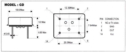 2、長方的,使用DIP-14封裝,打點的是1腳。1-NC; 7-GND; 8-Output; 14-VCC