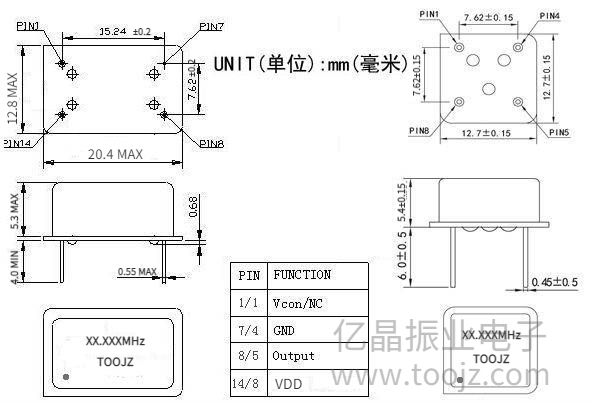 全尺寸封裝(DIP14):四個(gè)直插腳,尺寸為20.8*12.8MM,無(wú)微調(diào)孔