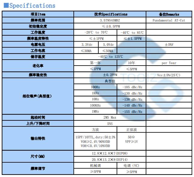 3.579545MHZ溫補(bǔ)晶振TCXO參數(shù)表: